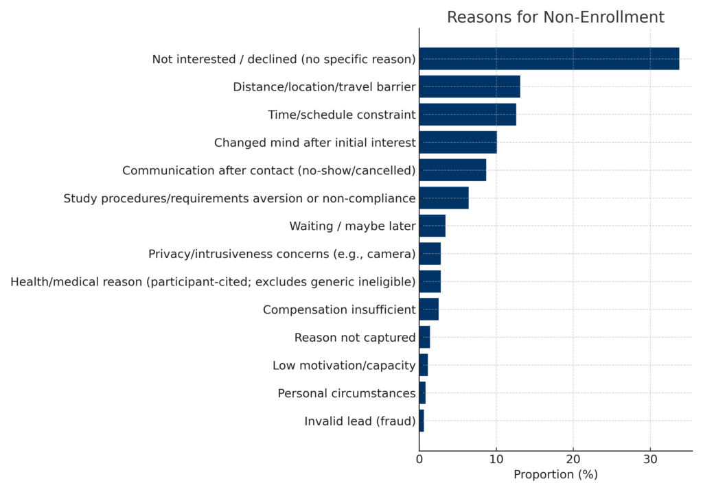 - Concerns about procedures or safety (24%) – Participants worried about risks, side effects, or misunderstood study requirements.